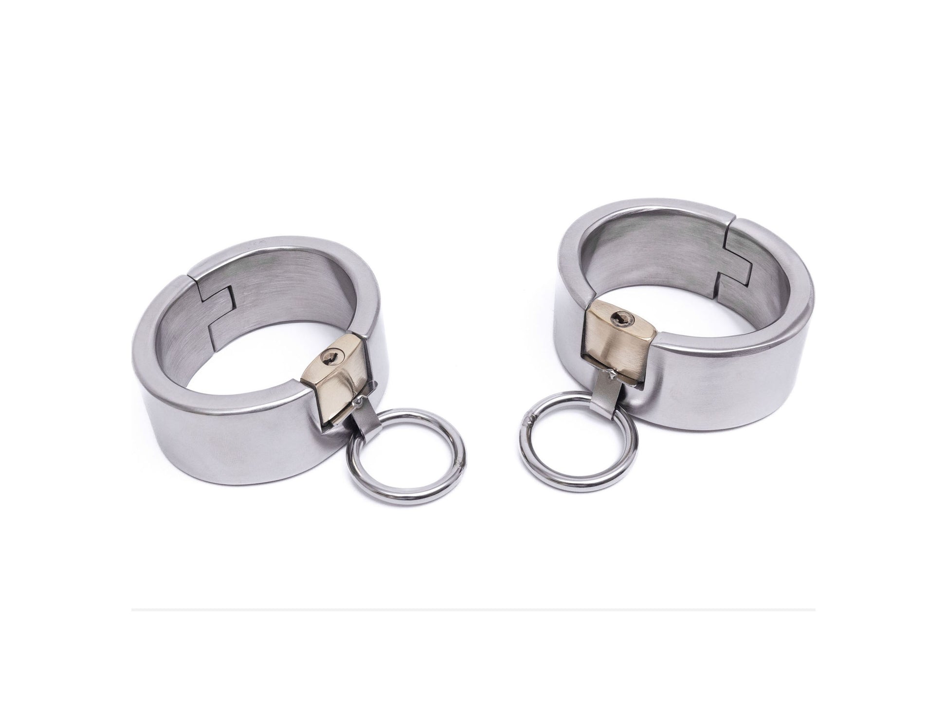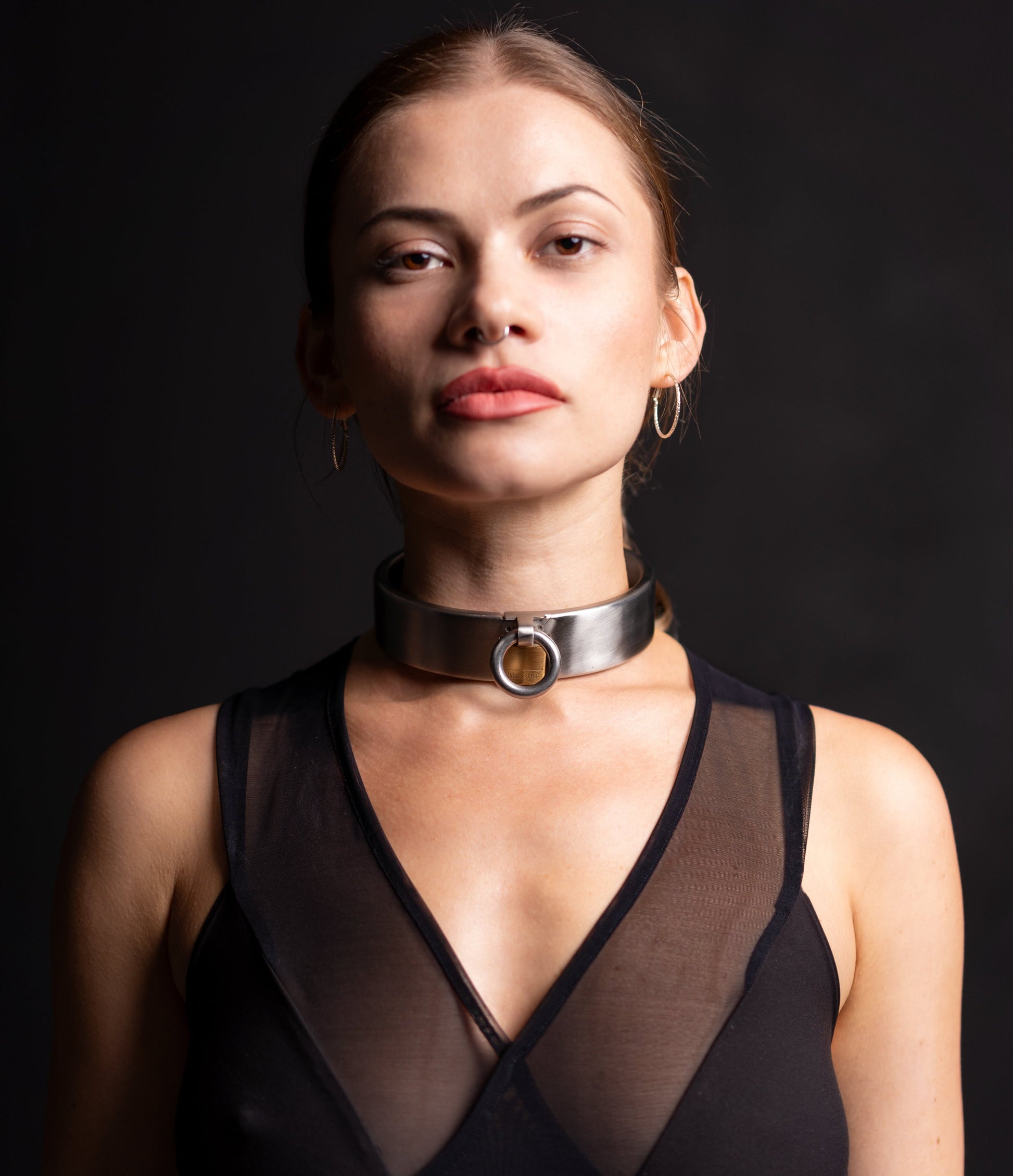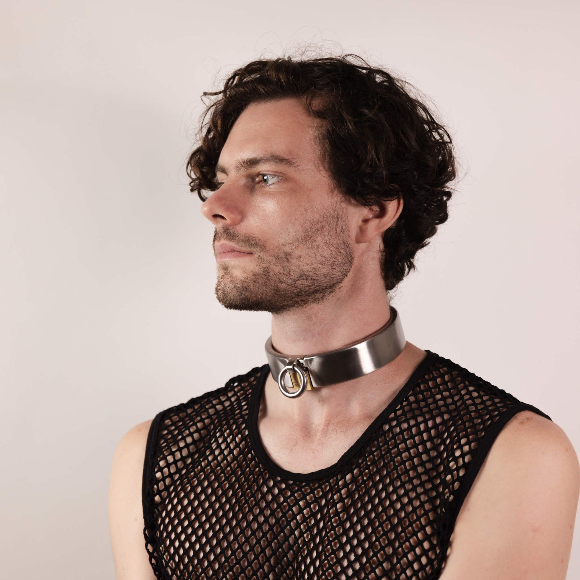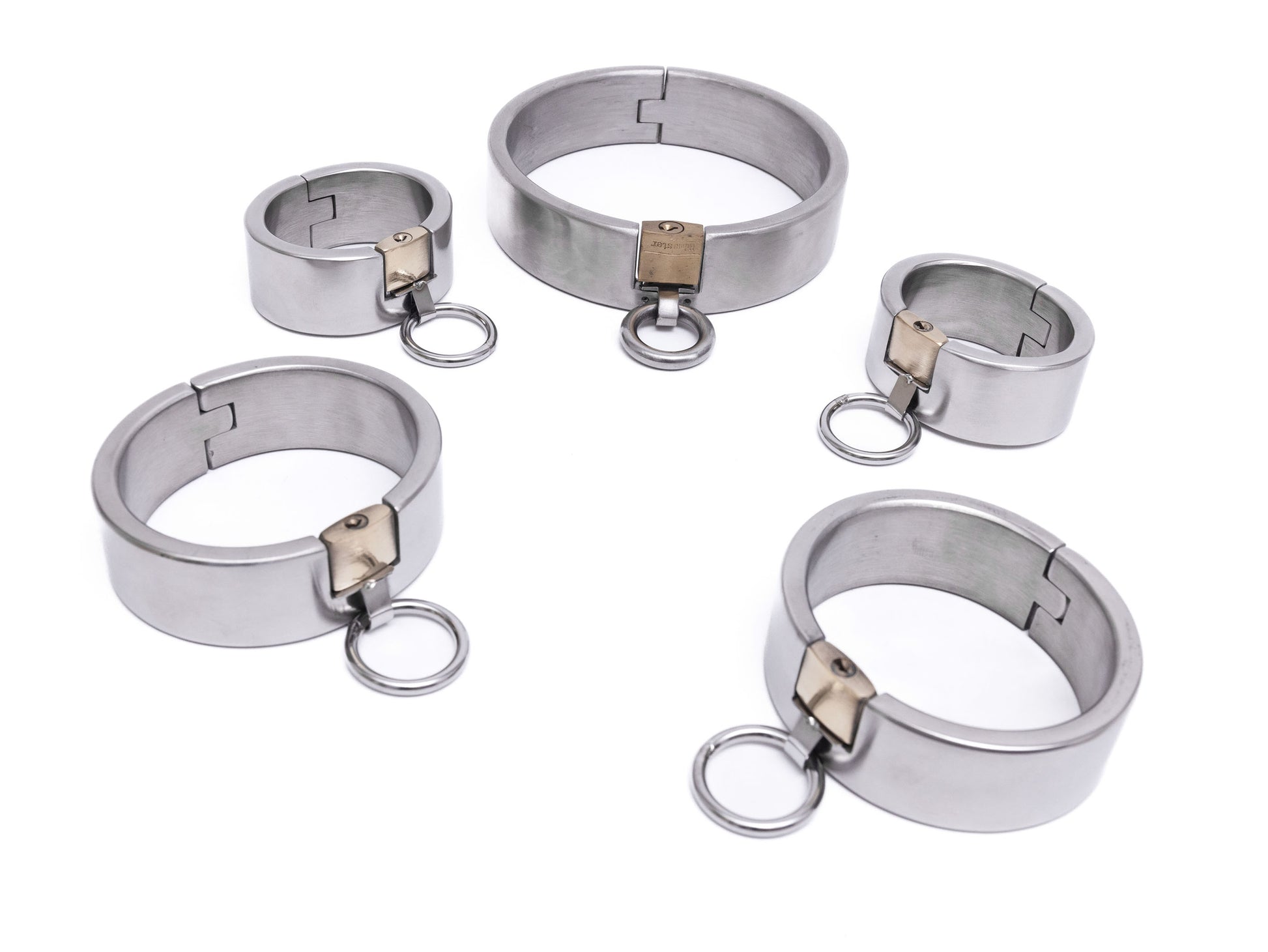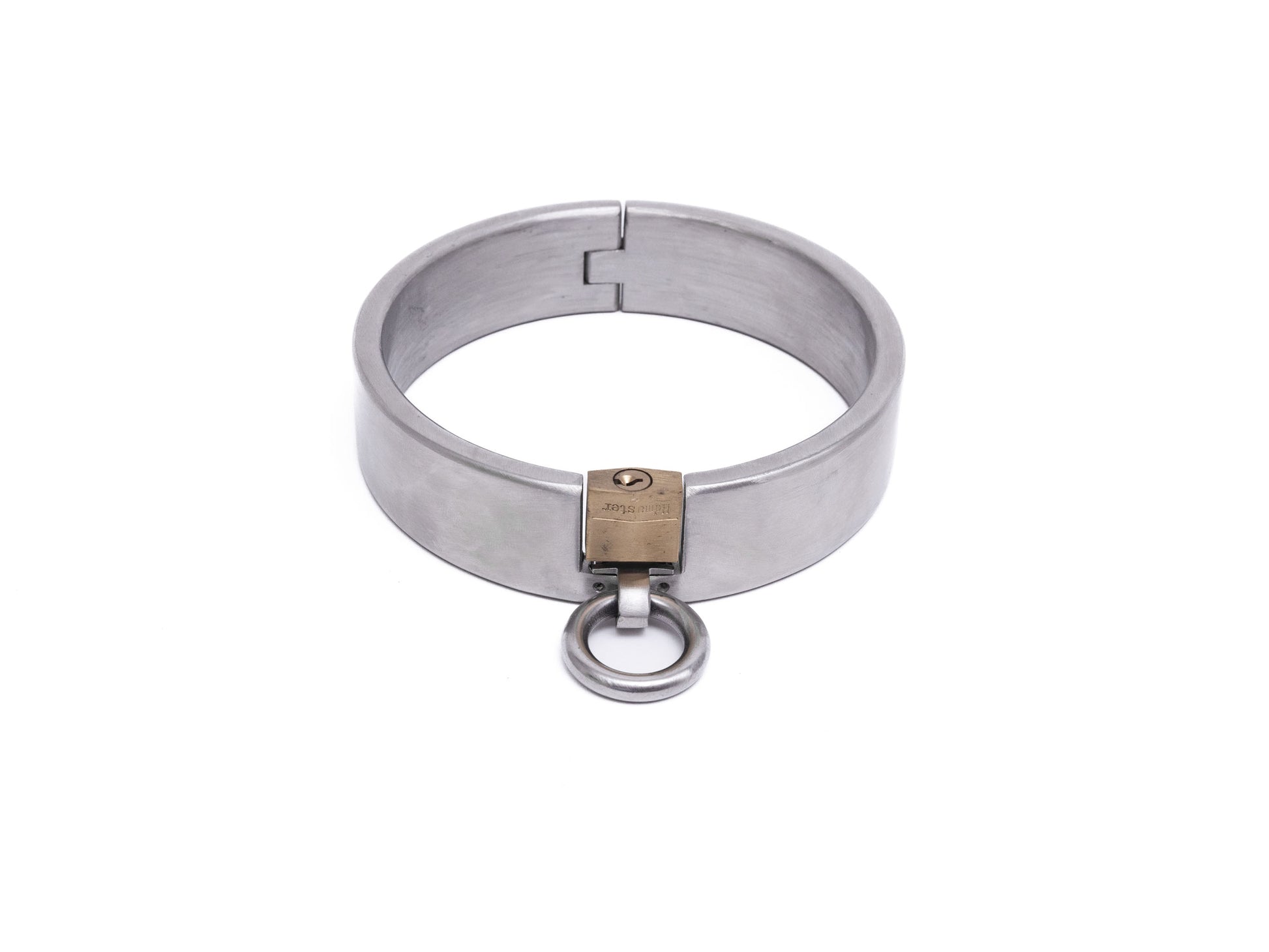 Entdecken Sie die materielle Ausprägung der Unterwerfung und führen Sie mit Härte und Eleganz. Verpassen Sie Ihrem Sklaven massiven Stahl, spürbar in Gewicht, Restriktion und erniedrigender Optik. Nutzen Sie alternativ den Halsreif, um Ihre Selfbondage-Abenteuer zu versüßen.
