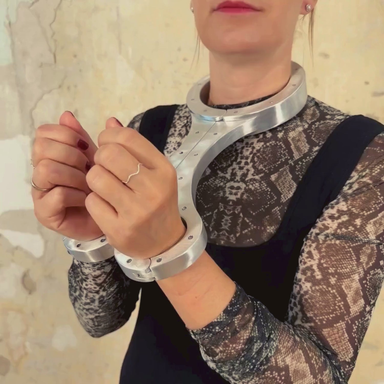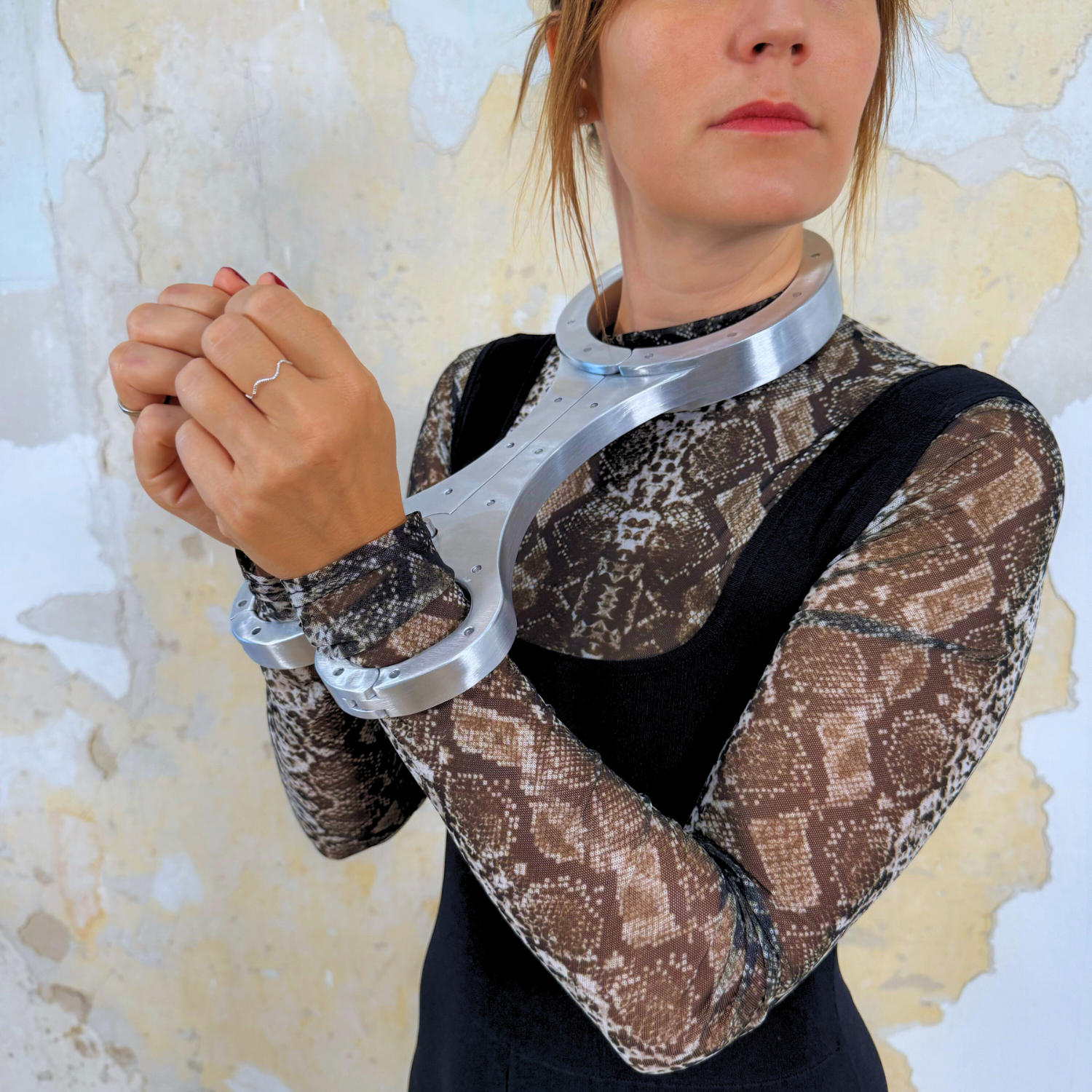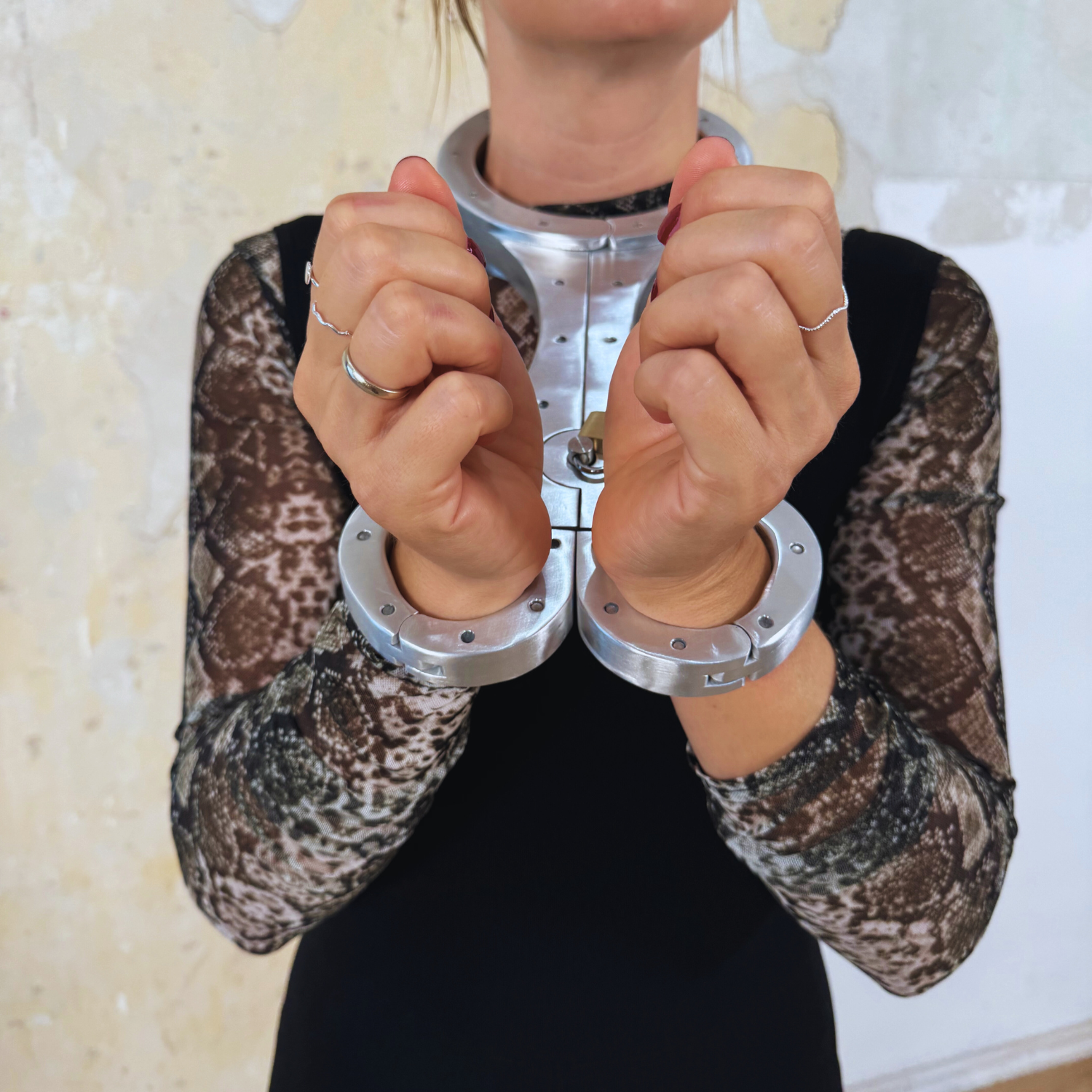 To close it, simply close the hand openings and move both halves towards each other. Then all you need to do is insert the pin and secure it with the padlock provided. It is no longer possible to escape, even with the key.